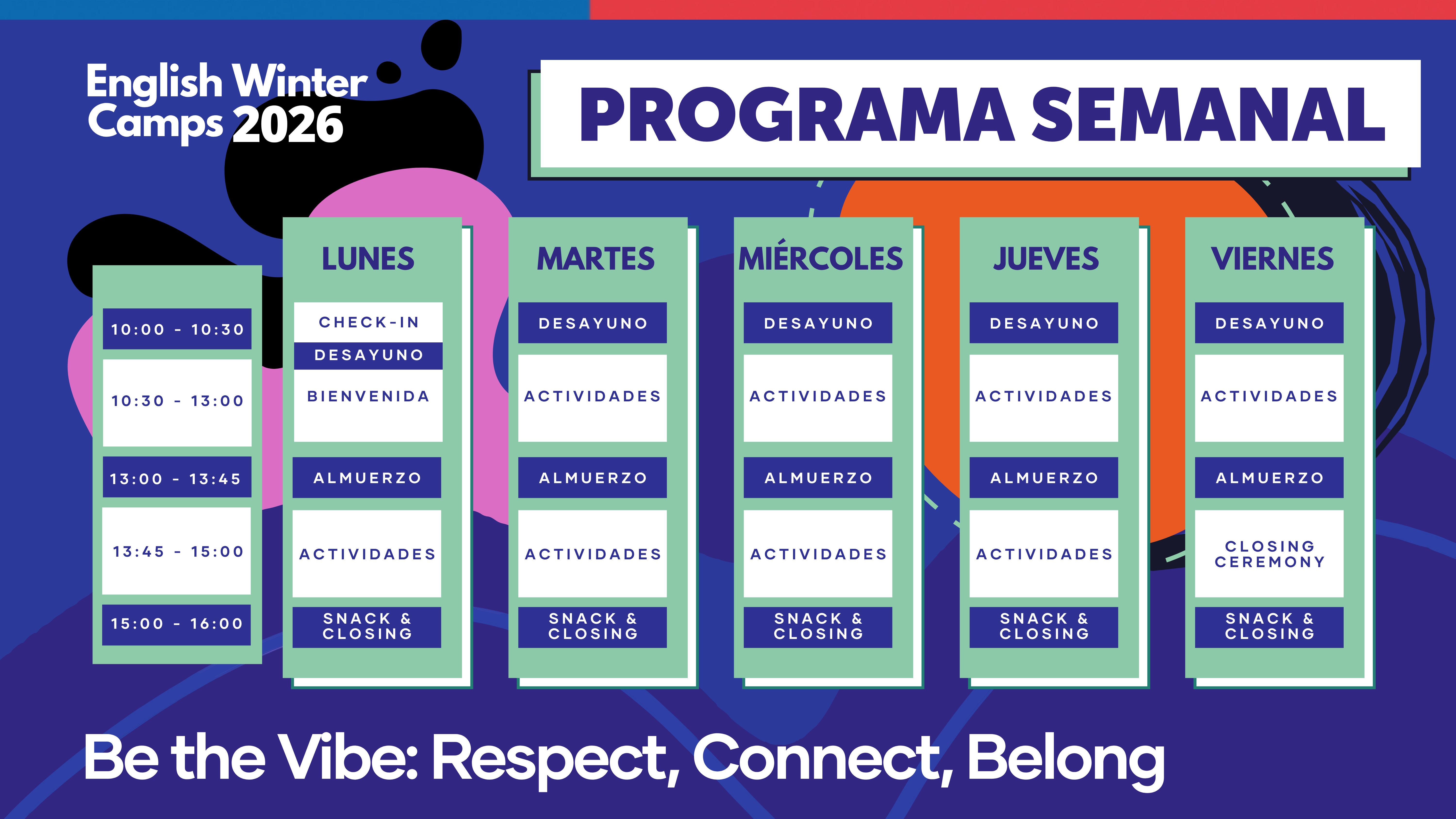 En esta edición, el lema es “Be the Vibe: Respect, Connect, Belong”, una invitación a ser parte activa de una convivencia positiva, basada en el respeto, la inclusión y la conexión con otros. A lo largo de la semana, podrás desarrollar tus habilidades comunicativas en inglés mientras reflexionas sobre la empatía, el trabajo en equipo y la importancia de construir espacios donde todas y todos se sientan parte.